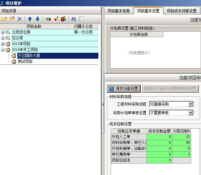 1. 以項目【萬達國際大廈】為例,首先要給項目設定一個控制比例,在工程管理模塊【項目維護】中,選擇好項目之后,在項目基本設置中設置控制比例,這里的控制比例與前面的成本控制金額無關,是人工、材料、機械、其他費在付款時所占項目收款的控制比例。如下圖:紅框所畫位置為付款控制比例人工費占15%、材料費占45%、外包機械和車輛運輸占5%、其他費3%