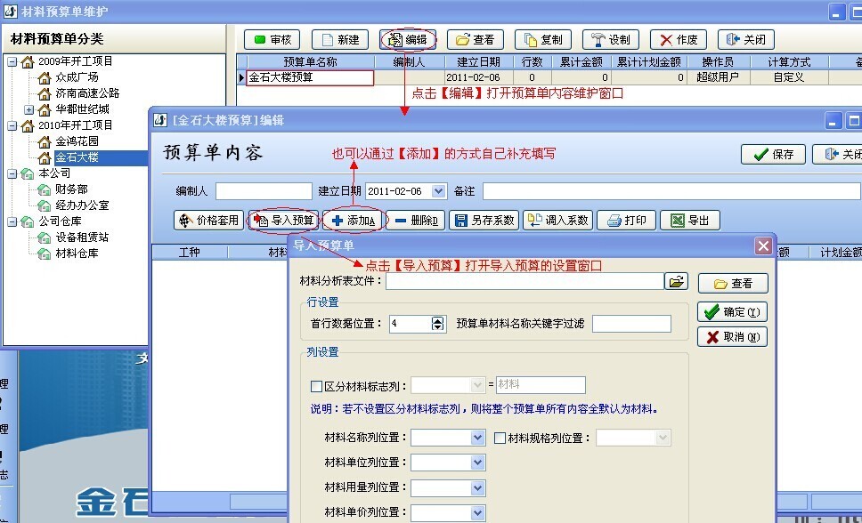 注:以上只是演示了導(dǎo)入預(yù)算的全過(guò)程,在實(shí)踐當(dāng)中還是建議用戶只將大材料用手工【添加】的方式建立預(yù)算單,因?yàn)榱阈堑牟牧厦Q多而且繁雜,如果也要將零星材料從預(yù)算中導(dǎo)入、再做一一對(duì)應(yīng),這樣勢(shì)必給用戶帶來(lái)很大的工作量。況且零星材料也不好準(zhǔn)確估算出實(shí)際用量。