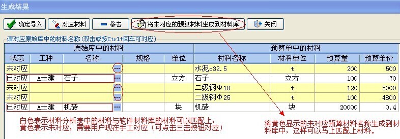 導(dǎo)入完的生成結(jié)果,(由于預(yù)算軟件中生成的材料分析表里的材料名稱與實(shí)際發(fā)生的材料名稱有些差異,這里需要用戶將未對(duì)應(yīng)的材料做下手工匹配)