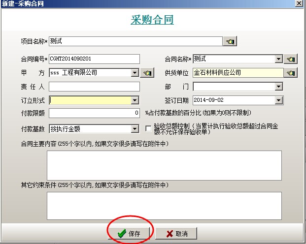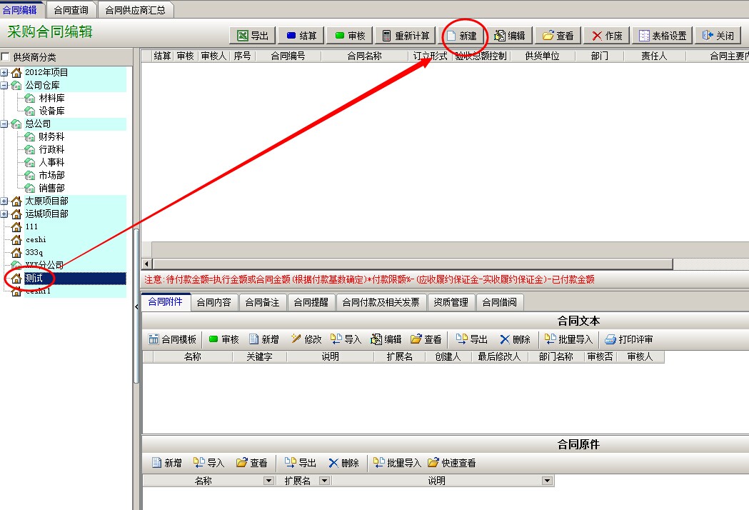 打開采購合同,左側(cè)選擇相應的項目,右邊點新建,錄入采購合同相關(guān)信息,保存。