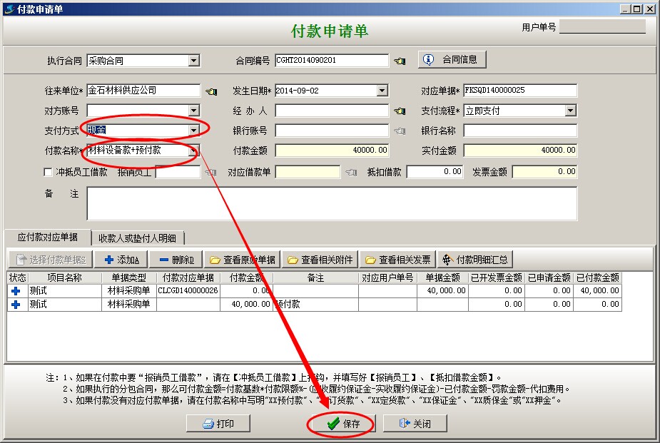 注:上圖所示;付款申請單的兩行明細為兩個材料采購單,第一行的[付款對應單據(jù)]為CLCGD140000026已付款金額40000已經(jīng)等于單據(jù)金額(表示該采購單已經(jīng)付完,是通過上一個付款單自動對應上的付款數(shù)),所以付款金額為0,第二行的[付款對應單據(jù)]為空,表示本項支付的款項為預付款),上面的付款名稱為材料設(shè)備款+預付款;