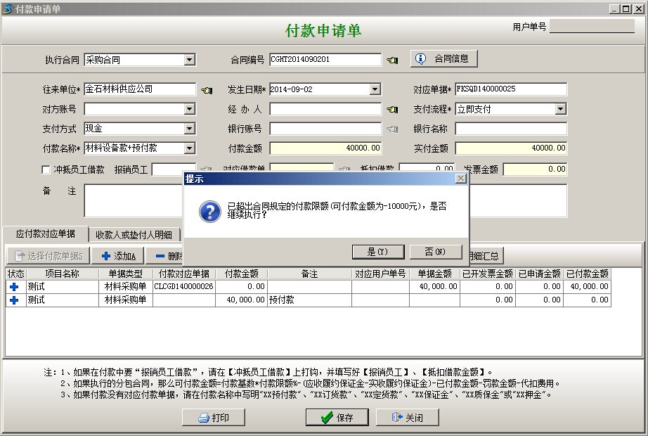 彈出付款申請單,付款名稱自動默認材料設(shè)備款+預付款,付款明細是自動帶入的,選擇支付方式點保存,會出現(xiàn)提示窗口根據(jù)下面截圖進行選擇繼續(xù)。