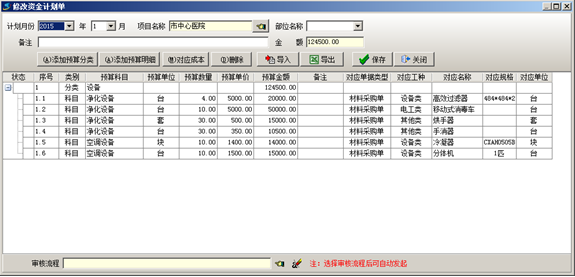 例如下圖所示:預(yù)算分類(lèi)為設(shè)備,明細(xì)科目為凈化設(shè)備,對(duì)應(yīng)的名稱可以為高效過(guò)濾器、移動(dòng)式消毒車(chē)、烘手器等。