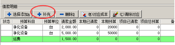 在請(qǐng)款過(guò)程中, 如果出現(xiàn)預(yù)算以為的請(qǐng)款,如:運(yùn)費(fèi)、裝卸費(fèi)等,可以利用補(bǔ)充按鈕來(lái)進(jìn)行補(bǔ)充。