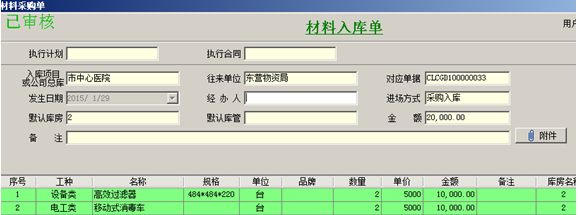 以上面的借款為例,我們來(lái)做一張付款申請(qǐng)單,首先是做業(yè)務(wù)單據(jù),采購(gòu)相應(yīng)設(shè)備(這里設(shè)備不是公司的固定資產(chǎn),而是需要給客戶安裝的設(shè)備,所以是歸到材料類(lèi)中)應(yīng)該做采購(gòu)入庫(kù)單(材料采購(gòu)單)。