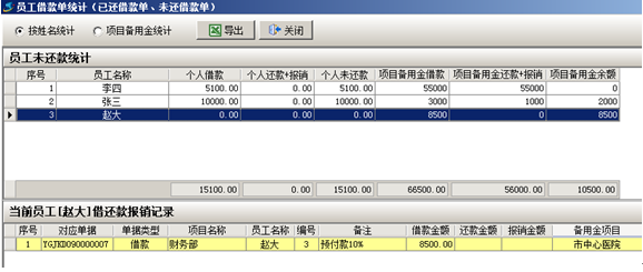 請(qǐng)款審核完成后,接下來(lái)是財(cái)務(wù)人員把錢(qián)支付給請(qǐng)款人然后執(zhí)行【員工請(qǐng)款單】生成【員工借款單】。下圖所示:生成【員工借款單】后在員工借款單統(tǒng)計(jì)中可以看到,目前借款人趙大,項(xiàng)目備用金借款為8500元。