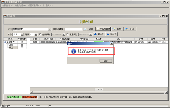 生成考勤單據時可在“考勤處理”對話框左側要生成考勤的用戶對應的復選框后面打鉤,并點擊“生成考勤單”的按鈕,選擇考勤項目之后系統提示考勤單已生成,如圖所示: