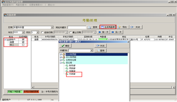 項目上的工作人員不方便到公司簽到,可在安卓手機上下載并安裝好金石軟件的手機客戶端之后登錄手機客戶端進行簽到。需要查詢并處理考勤信息的用戶在查詢信息前要先進入到“系統維護”-“用戶管理權限設置”里面進行“手機考勤管理地區授權”的設置,被授權的用戶就可以查看并處理被授權地區的手機考勤的信息。如圖: