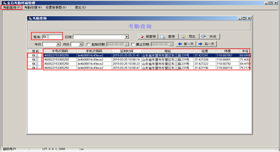 手機簽到成功之后,在服務器端登錄系統之后,有查看權限的人可以進入“手機考勤管理終端”查看員工的簽到信息并進行管理。如需查看考勤信息可點擊“考勤查詢”的按鈕,可按照“姓名”進行查詢,或者輸入被授權的“地區名稱”進行查詢,輸入“姓名”查詢到的是對應的員工的簽到信息,輸入地區名稱查詢到的是在對應地區內簽到的所有員工的查詢信息,如圖: