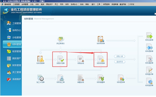 第一步,進入系統的【材料管理】模塊,點擊[采購合同],如圖:
