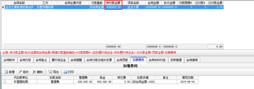 在工程項目資質掛靠管理中乙方B借用乙方A的資質,乙方A需要扣除乙方B管理費,如果需要乙方A代開發票還需要扣除稅金。在分包合同中[扣繳費用]模塊下操作,如下圖: