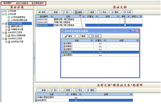 操作方法:在窗口左側選擇要做簽證的項目,在右側窗口點擊“新建”按鈕,輸入名稱后,點“編輯”按鈕,選擇一個簽證模板后,即可開始編輯簽證文檔。