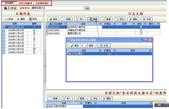 A添加施工日志:首先選擇項目名稱,在“日期列表”下點“添加”按鈕,選擇日期。然后在右側的“日志文檔”下新建一個日志文檔,然后選擇“編輯”按鈕,選擇一個“日志模板”建立日志文件可記錄工程項目施工進度。也可以直接導入已寫好的現成日志文檔到軟件中,或者將寫在日記本的日志用數碼相機或掃描儀做成圖片格式直接導入到軟件中。