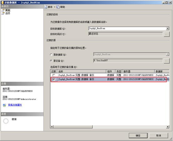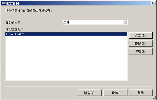 進入“指定備份對話框”,點擊“添加”,進入指定數據庫文件窗口,瀏覽并找到需要還原的數據庫備份文件,點擊“確定”, 點擊“確定”后回到指“定備份”對話框,此時需要還原的文件已經列出來了,接著點擊“確定”,返回“還原數據庫”。如圖: