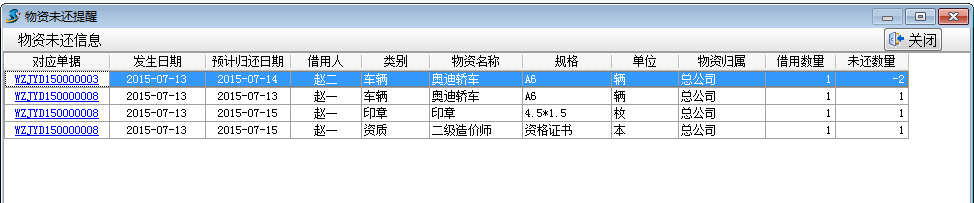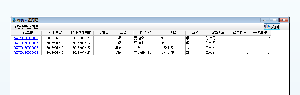 在填寫物資借用單時,填寫好預計歸還日期,當到預計歸還日期時,會自動提醒物資未還信息。如下圖: