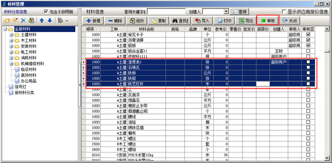 在金石工程管理軟件中可對添加的“材料信息”進行審核(此功能為可選功能)。如圖: