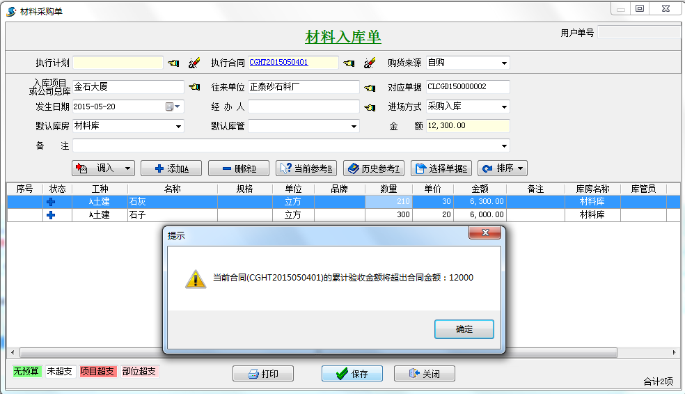 在工程項目管理系統中當我們驗收金額超過總額時系統會自動提示,并且材料采購單不能保存。如下圖