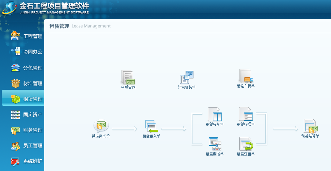 在建筑施工中,材料往往是通過采購或者租賃得來的。所以在建筑材料管理軟件中還要對租賃的材料進行對應(yīng)的管理。建筑材料管理軟件針對材料租賃過程中的材料租入合同、材料租入、材料租入還租、材料租入報停和材料租賃結(jié)算實行一體化流程管理。建筑材料管理軟件中材料租入合同是租賃業(yè)務(wù)的指導(dǎo)性文件。合同簽訂之后,租入、歸還、報停的后續(xù)操作都圍繞合同而開展,甚至在進行租入結(jié)算時軟件會自動調(diào)用租入合同所采用的“日期計算方式”和所擬定的“日租金單價”。