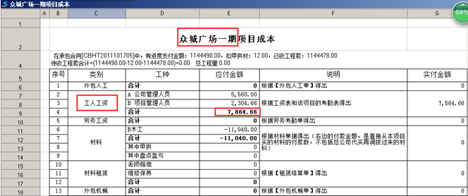 “眾城商場一期”項目成本-“工人工資”,如圖: