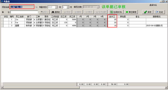 例如,Jim、Tom、高霞都是在同月出勤了兩個項目“眾城廣場一期”和“眾城廣場二期”,則在工程管理軟件中四月份分別做兩給項目的考勤表。如圖: