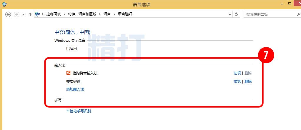 打開輸入法界面,刪除除了使用輸入法之外的所有輸入法,也包括英文輸入法,可以只保留搜狗或者微軟拼音,等輸入中文正常之后,再添加英文輸入。