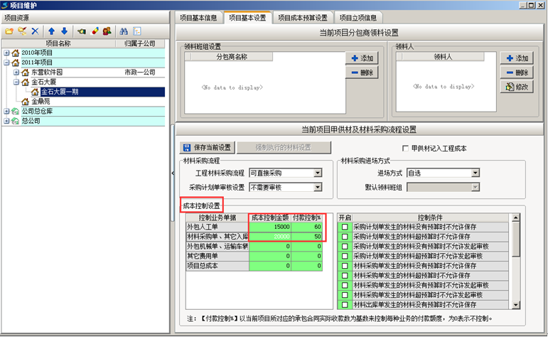 新建分包合同,在付款基數(shù)選擇“按合同金額”(統(tǒng)計成本是可按照合同金額統(tǒng)計成本),并輸入付款限額。如圖所示: