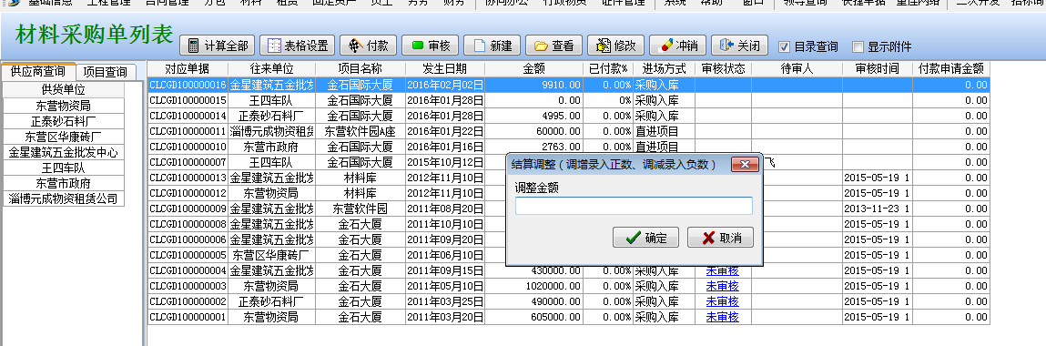 項目管理軟件在成本結算時,供應商總會對一些價格進行一些優惠或者對總金額零頭進行抹去,這時就需要用到結算金額調整。該功能一般適用于單據已審核,或者需要掛賬結算時使用。