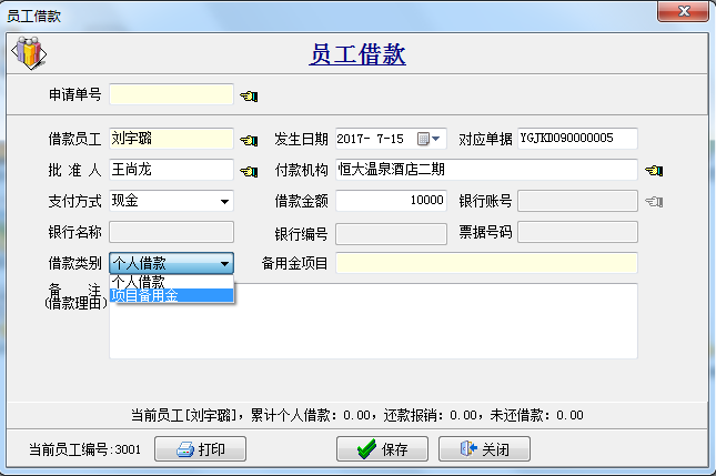備注:?jiǎn)T工借款分為個(gè)人借款和項(xiàng)目備用金,其中選擇項(xiàng)目備用金主要用于大額的采購,是專款專用的,不能用于其他項(xiàng)目
