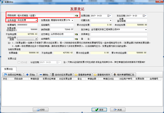 ③“分包合同”“按承包合同收款”,并“對應(yīng)承包合同編號” “關(guān)聯(lián)成本項目”(為了查詢發(fā)票情況自動匯總和歸屬分類)