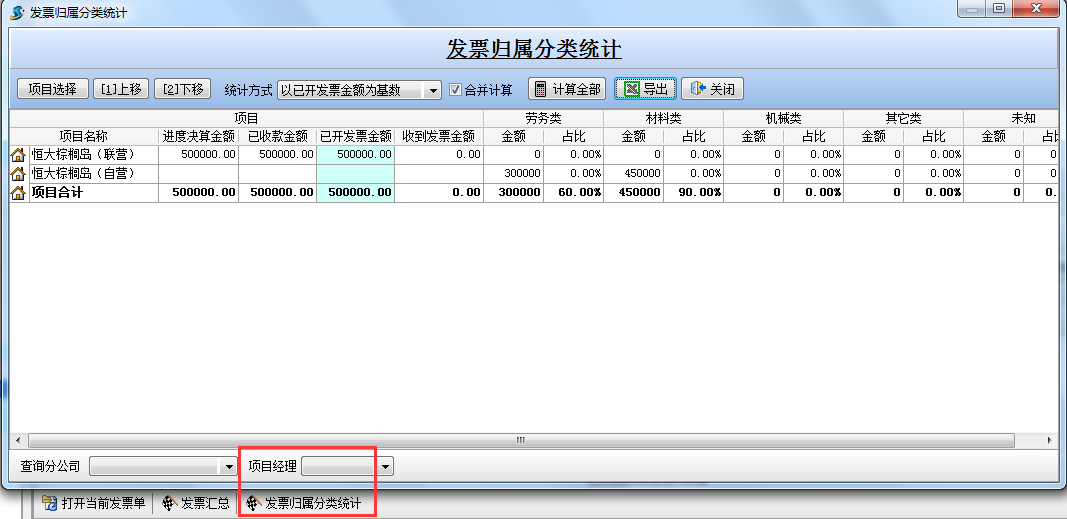 發(fā)票歸屬分類統(tǒng)計(在一個項目中應(yīng)控制材料票、勞務(wù)票等所占的比例,此功能用于計算掛靠單位發(fā)票歸屬所占百分比)