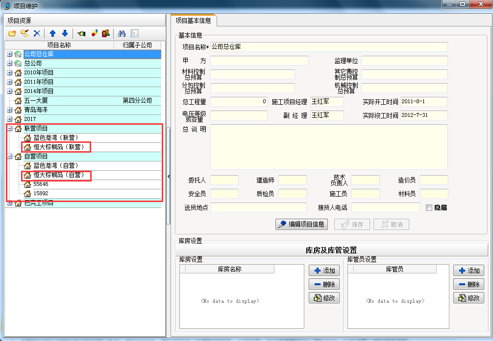 注:首先在項目維護中維護兩個大類(自營項目和聯(lián)營項目),兩個大類分別建立項目,其中在“自營項目”中記錄驗收(為了統(tǒng)計掛靠單位成本)和對應(yīng)發(fā)票(為了統(tǒng)計發(fā)票歸屬分類),“聯(lián)營項目”中只做【財務(wù)管理】收付款不做相關(guān)的成本業(yè)務(wù)單據(jù)(如下圖)。