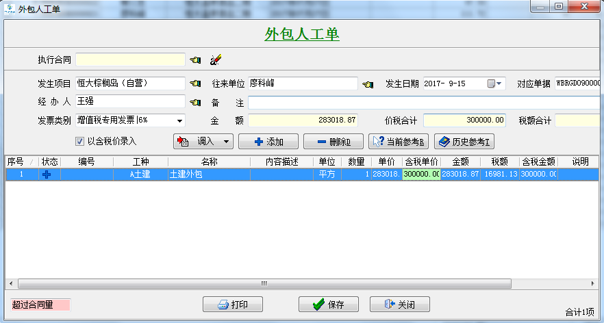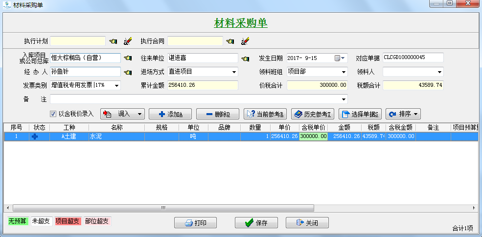 ①在“恒大棕櫚島(自營)”項目下驗收(如有預(yù)算先做預(yù)算單)【材料采購單】和【外包人工單】各30萬元并對應(yīng)“進項發(fā)票”。