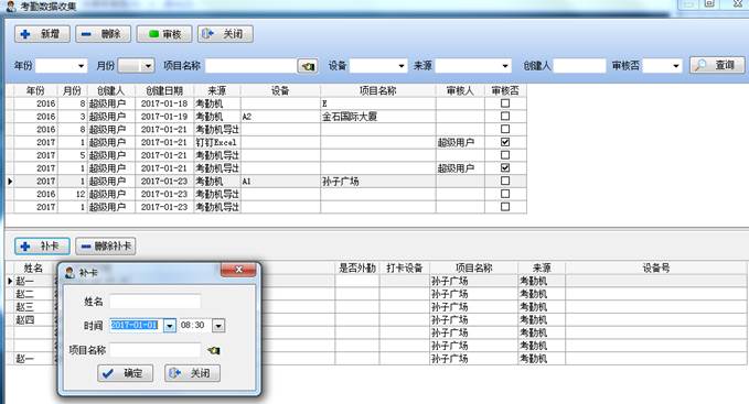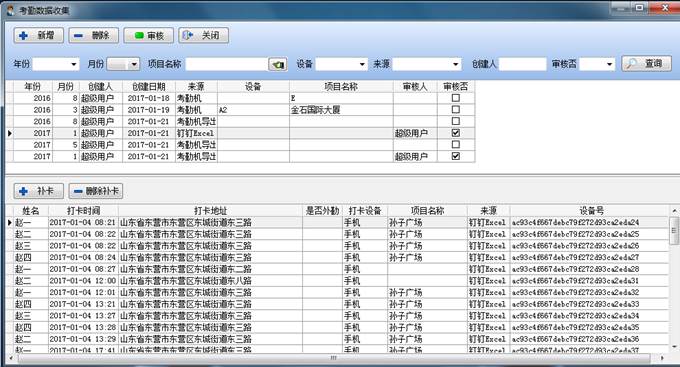 在考勤設(shè)備讀取操作界面也有相應(yīng)的查詢篩選項,可以通過年份、月份、項目名稱、設(shè)備、來源、創(chuàng)建人、審核否等相關(guān)信息來篩選查詢從考勤設(shè)備讀取的信息。
