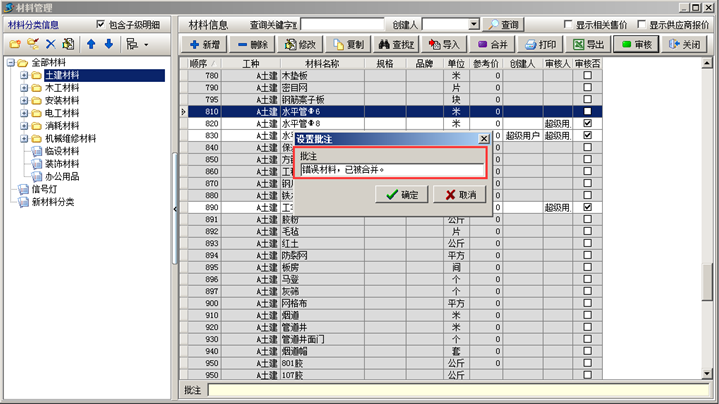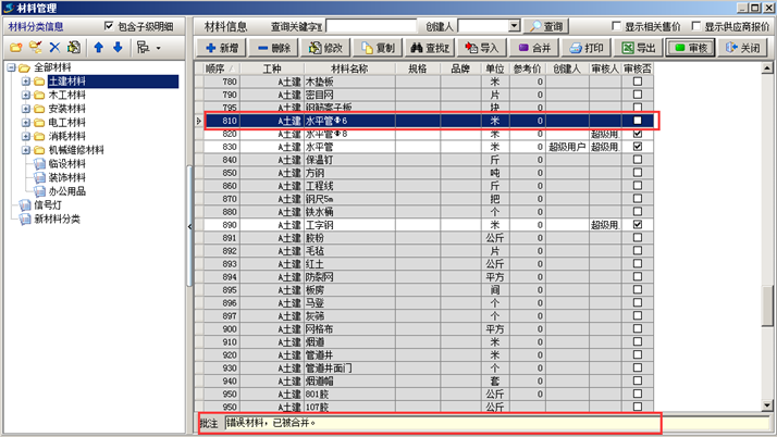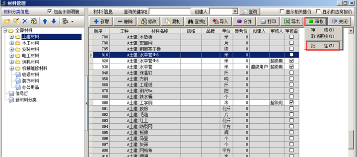 在工地人員使用工程管理軟件錄入業(yè)務(wù)單據(jù)過程中,往往對工程管理軟件的材料庫中維護員添加的材料不熟悉,已經(jīng)維護好的材料在工程管理軟件中經(jīng)常找不到,自行添加了材料,但自己添加的材料和維護員添加的材料名稱差別很大,這樣程序無法識別是否有重復(fù)。此時需要讓維護員利用工程管理軟件的 【審核提醒】+【事后糾正】+【錯誤批注】 來在過程中指導(dǎo)工地人員的使用,糾正和統(tǒng)一材料的名稱的叫法。