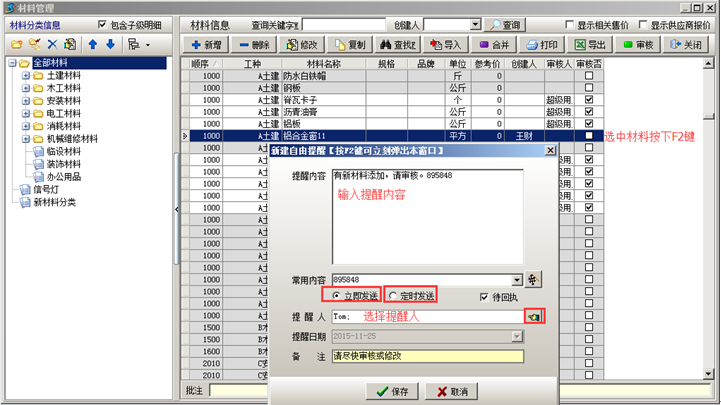 (注:該提醒需要讓做工地上添加新材料的人按F2鍵單獨給維護員發(fā)一條信息,也可以開通手機提醒功能來提醒材料維護員)