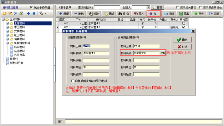 將已經(jīng)存在于工程管理軟件材料庫中的材料進行【合并】,選中錯誤的材料,點擊“合并”,在彈出的“合并材料”的對話框中選擇正確的材料名稱,所選擇的材料名稱必須是系統(tǒng)中已經(jīng)審核通過的材料。如圖所示:
