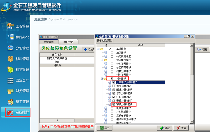 1、首先將 “審核_材料”的功能單獨分配給材料維護員一人。在系統(tǒng)中給工作人員分配權(quán)限,如圖所示:
