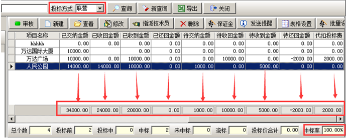 在工程管理軟件項(xiàng)目開(kāi)拓列表中可以查詢多個(gè)項(xiàng)目投標(biāo)保證金的九項(xiàng)合計(jì),如圖所示:也可根據(jù)投標(biāo)方式、業(yè)務(wù)員、項(xiàng)目狀態(tài)查詢。
