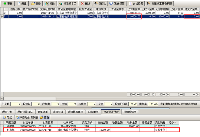 付款完成,工程管理軟件中待交納金額減少,已交納金額增加,并且可查看到對(duì)應(yīng)項(xiàng)目的保證金付款記錄,如圖所示: