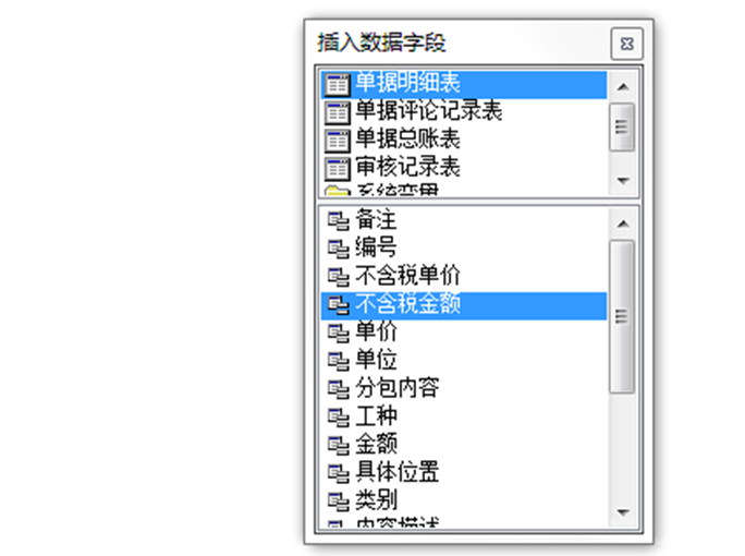 4. 系統和Excel最大的區別就是,我們可以直接從系統中調集數據。只要在懸浮窗【插入數據字段】中選擇對于的字段即可。