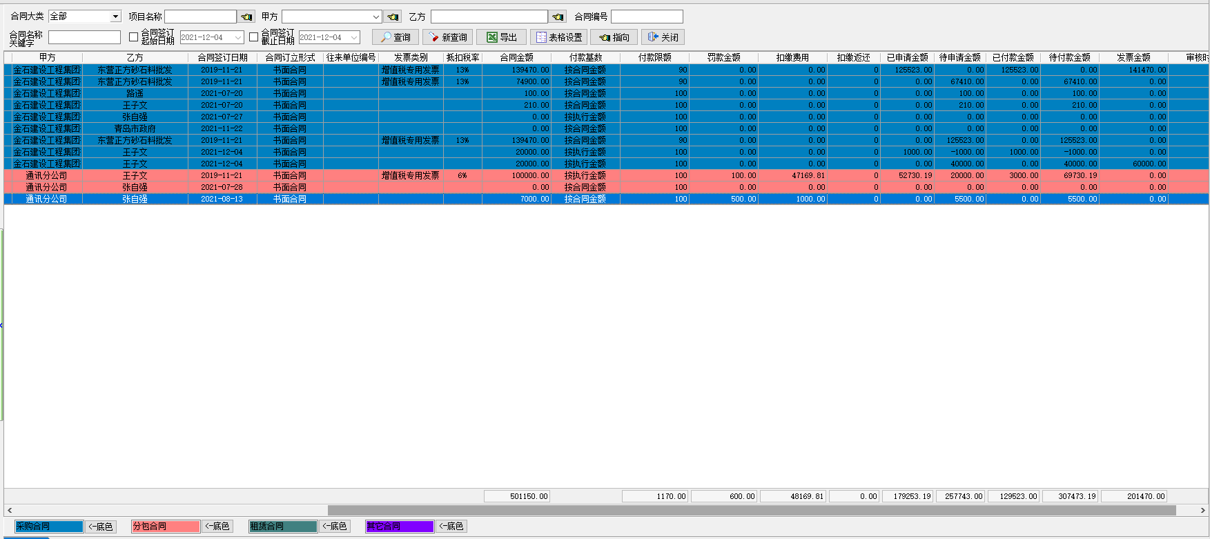 查詢內容包括:合同基礎信息(時間、甲乙方)、發(fā)票信息(類別、稅率)、金錢往來(付款、罰款、扣繳、已付款、未付款等信息)