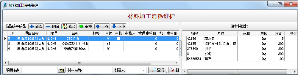 在實際應用中,根據預算軟件或其他方法獲得的詳細秘密配方不準確。在制造實驗過程中獲得的原材料秘密配方可輸入材料成本維護,并根據準確的配合比控制材料的數量和進度。