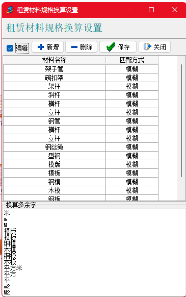 【租賃材料規格換算設置】可實現自定義指定某些租賃材料的總長度換算、總面積換算、重量換算,并可以自動去掉多余的字。