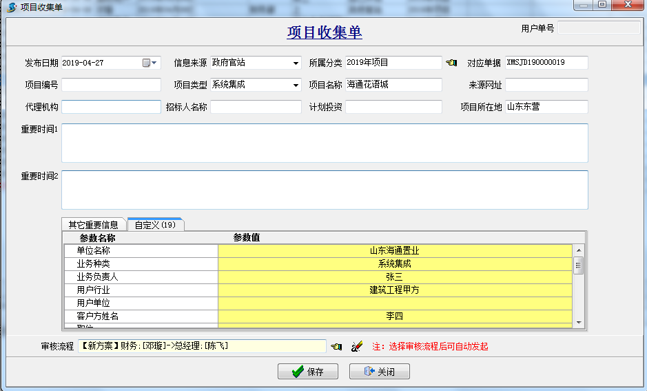 以上內容基本可滿足大部分公司的需求詳細操作流程請見前期的文章“項目收集單”,對于一些要求前期階段更加細致化的公司,金石軟件內也預留了項目收集單自定義功能,操作流程如下: