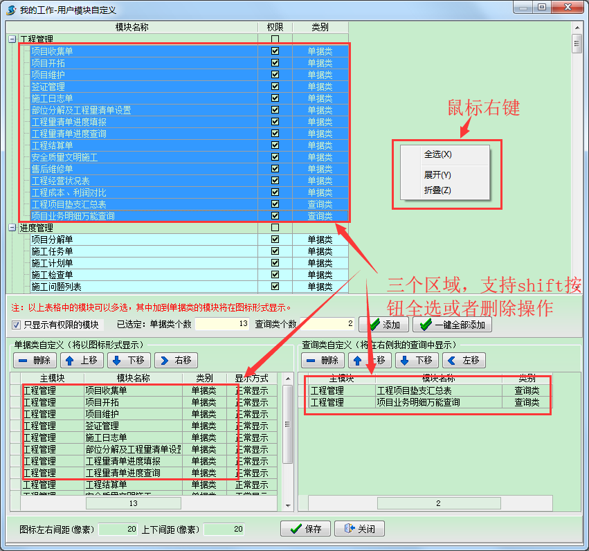(2)上方選擇區域、下方的單據類自定義和查詢類自定義區域中,都支持shift鍵 全選 操作。此外有一鍵添加所有功能的按鈕在。