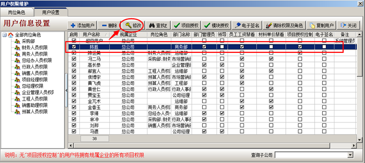 3.工程管理軟件中設置子公司員工:以員工陳勝為例講解,登錄超級用戶----系統維護----用戶管理權限設置。選中員工陳勝,點修改按鈕