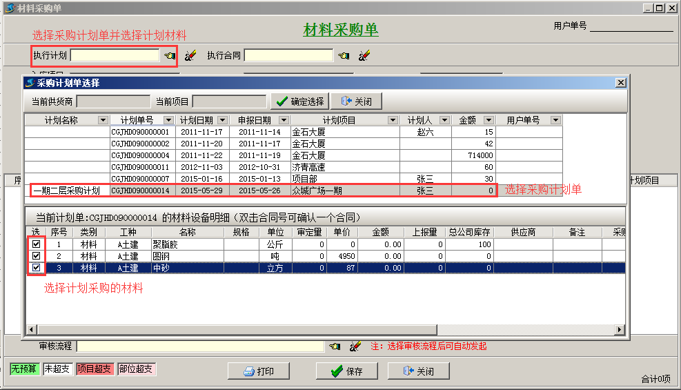 項目在工程項目管理軟件上報采購計劃,相關人員逐級審批通過,然后辦理采購,驗收入庫。(這種情況適合項目上大材批量采購,不需要簽訂供貨合同)。