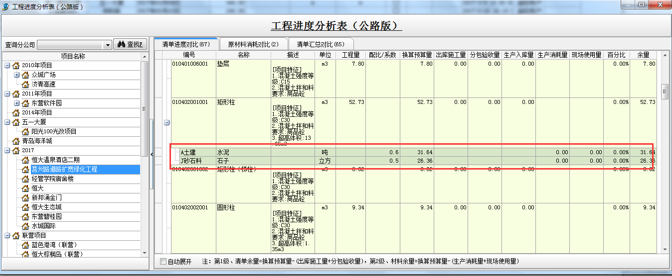 【編號(hào)、名稱、描述、單位、工程量、配比/系數(shù)】是根據(jù)軟件中部位分解及工程量清單設(shè)置得來(lái)的;【換算預(yù)算量】是根據(jù)工程量*配比/系數(shù);【出庫(kù)施工量】是根據(jù)做的材料出庫(kù)單或者材料調(diào)撥單出庫(kù)清單成本材料;【分包驗(yàn)收量】是根據(jù)做的外包人工單計(jì)算得來(lái)的; 【生產(chǎn)入庫(kù)量】是根據(jù)做的材料加工單成品材料得來(lái);【生產(chǎn)消耗量】是根據(jù)是根據(jù)做的材料加工單原材料得來(lái);【現(xiàn)場(chǎng)使用量】是根據(jù)做的材料出庫(kù)單或者材料調(diào)撥單出庫(kù)原材料;【百分比】是根據(jù)出庫(kù)施工量/換算預(yù)算量;【余量】:第一級(jí)清單余量=換算預(yù)算量-(出庫(kù)施工量+分包驗(yàn)收量),第二級(jí)、材料余量=換算預(yù)算量-(生產(chǎn)消耗量+現(xiàn)場(chǎng)使用量)。
