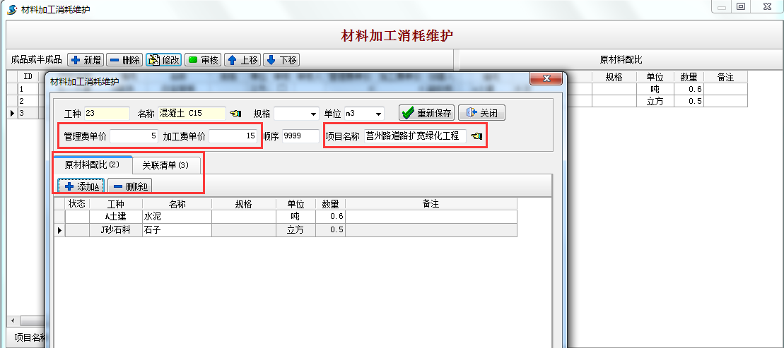 生產(chǎn)1立方混凝土用水泥0.6噸,石子 0.5立方,關(guān)聯(lián)清單 為3項(xiàng)表示該配比實(shí)用于以下3種清單 的混凝土。