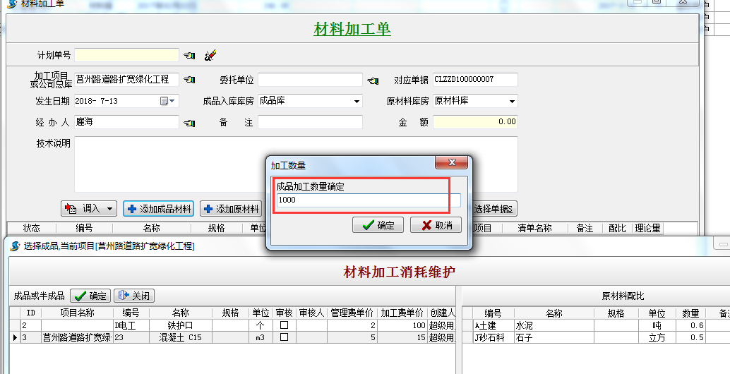 2.新建“材料加工單” 添加需要生產(chǎn)的成品材料,“從材料加工消耗維護(hù)中選擇”(上圖中做的材料加工消耗維護(hù))
